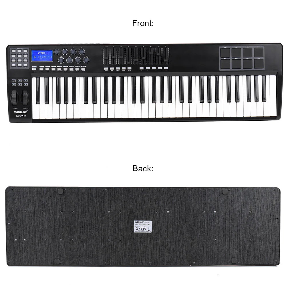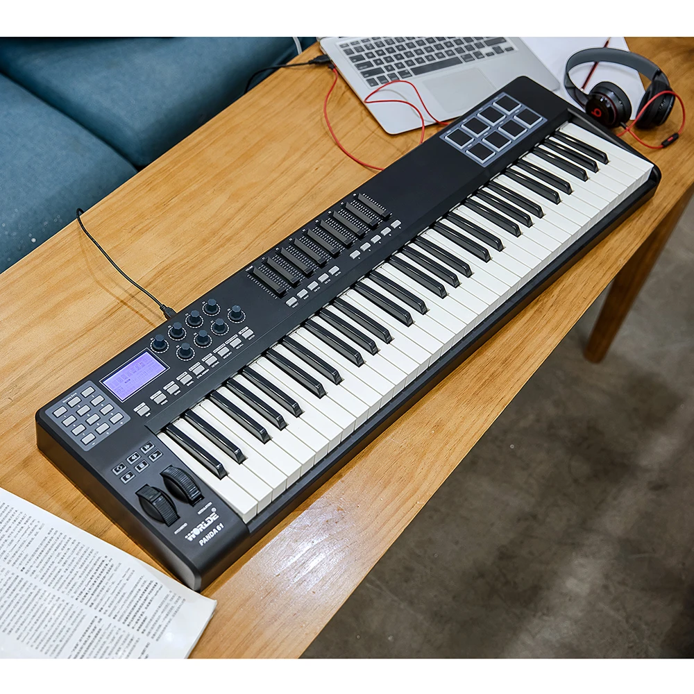 USB MIDI keyboard pad controller with 61 assignable velocity-sensitive keys, 1 master volume slider and 8 assignable sliders.
